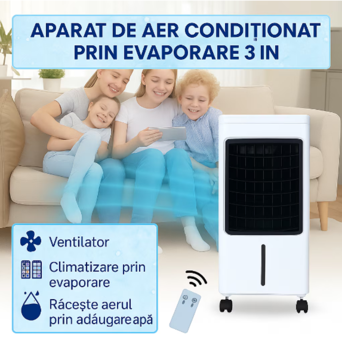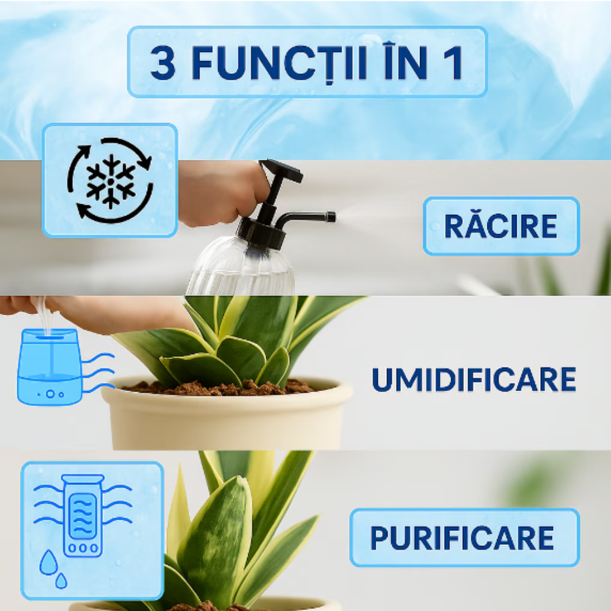 Răcire + Umidificare + Purificare! Un singur aparat care înlocuiește mai multe dispozitive. Ideal pentru spații uscate, oferind aer proaspăt, curat și la temperatura dorită..