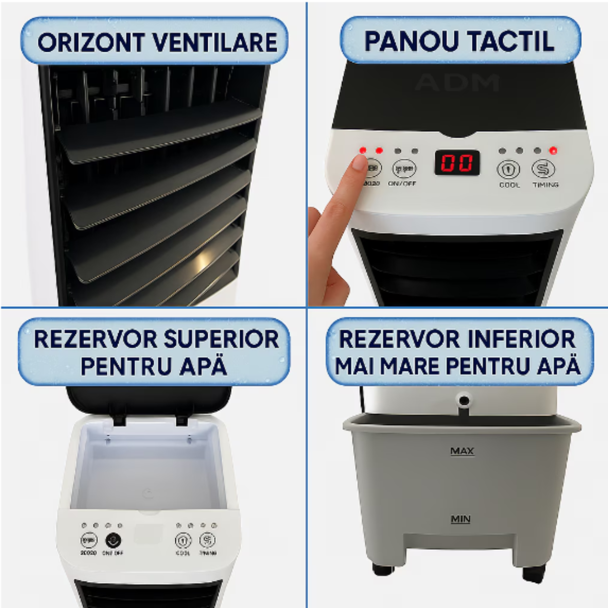 Tehnologie de răcire prin evaporare cu cristale de gheață! Rezervorul mare de 4L asigură funcționarea îndelungată, iar sistemul dual de umplere (superior și inferior) garantează confort continuu pentru întreaga familie.
